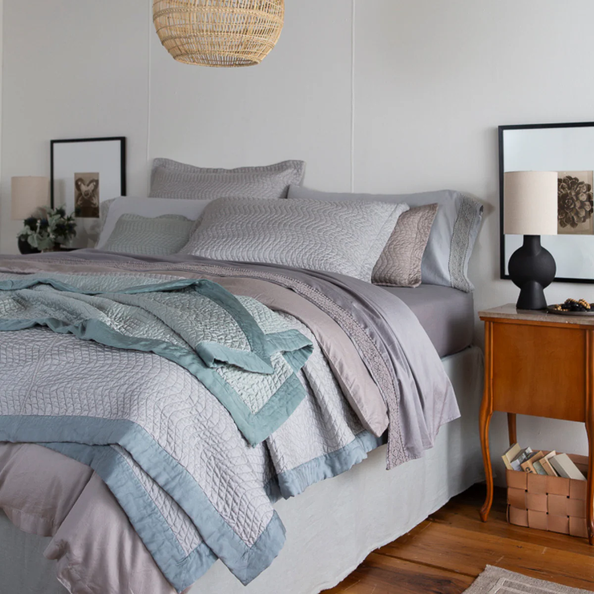Bearing a noble namesake, Cirillo is our first cotton-filled quilted collection. A calming wave pattern quilts 600-thread count cotton sateen, and the coverlet features a broad satin binding for a complementary tonal variation. Offered in twin, queen, and king sizes, this coverlet is a statement piece for bedding ensembles.
